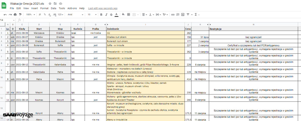 Poza tym, jak zwykle stworzyliśmy arkusz z podstawowymi informacjami. Znak czasów: musieliśmy dodać kolumnę z informacjami, jakie są aktualnie restrykcje covidowe.