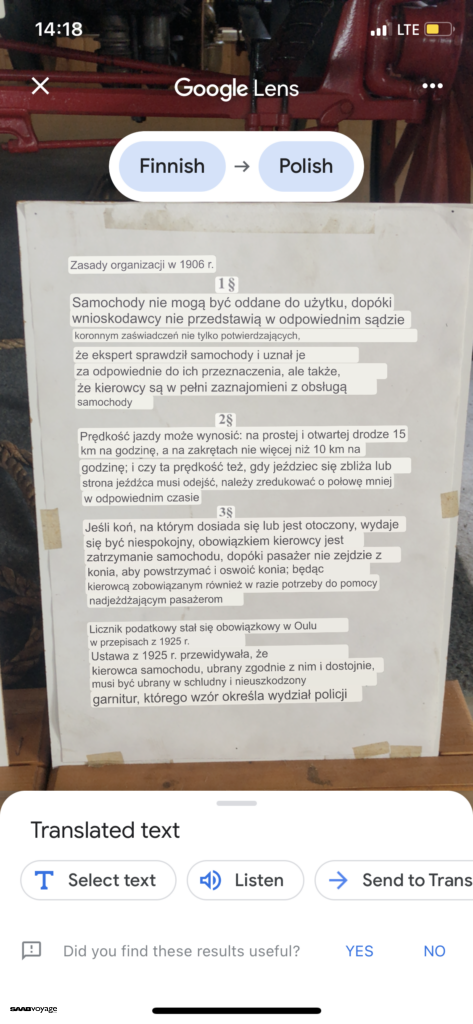 W muzeum można również zobaczyć wyciąg z regulaminu dla automobilistów z 1906 roku. Maksymalna prędkość to 15 km/h, na zakrętach 10 km/h. Kierowca ma być schludnie ubrany w garnitur. Żeby nie było, że znamy języka fińskiego, ratował nas google translate:
