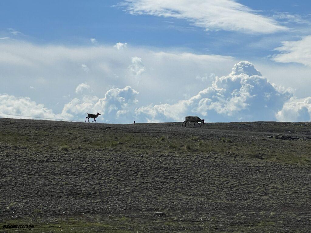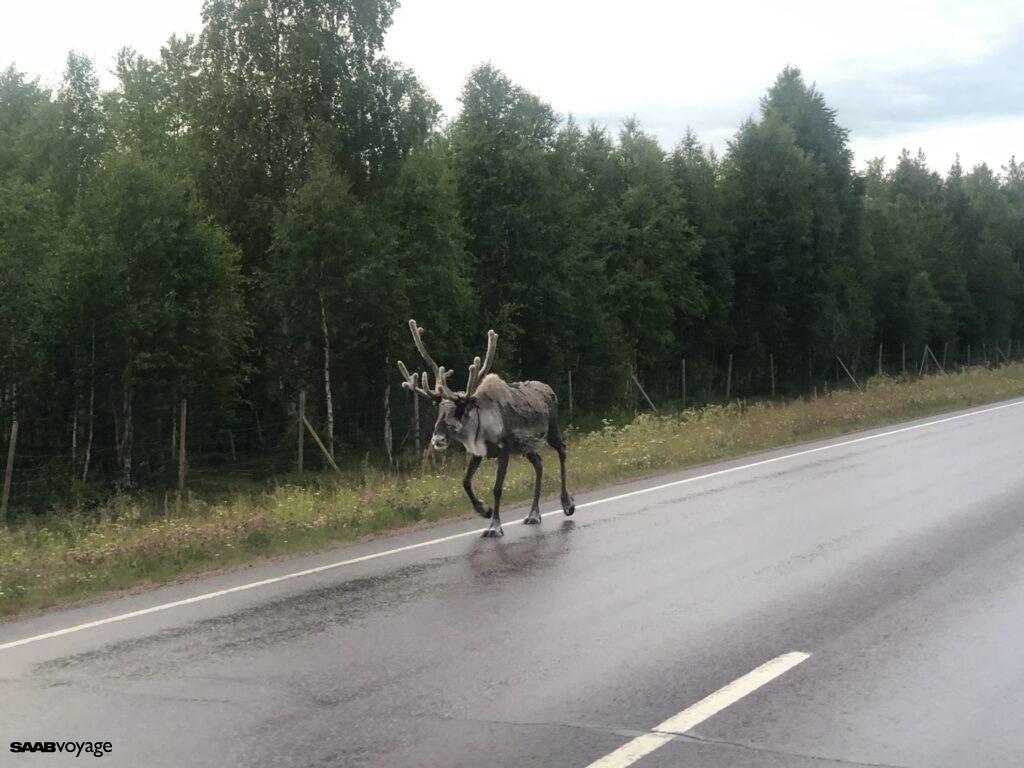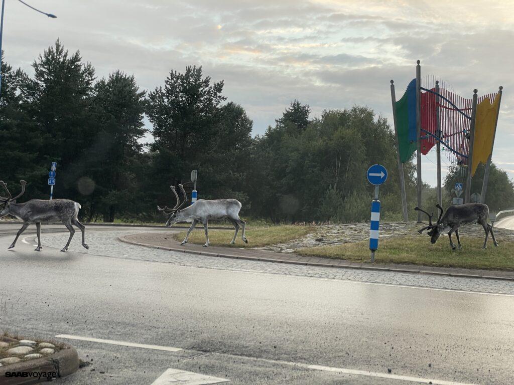 Po przekroczeniu koła polarnego zaczęliśmy zauważać renifery. Na drodze, przy drodze, wzdłuż drogi. Ale z kulturą i zachowaniem BHP. Renifer biegnący po asfalcie trzyma się swojego pasa, jeśli przechodzi przez jezdnię, to się rozgląda i idzie prostopadle.
